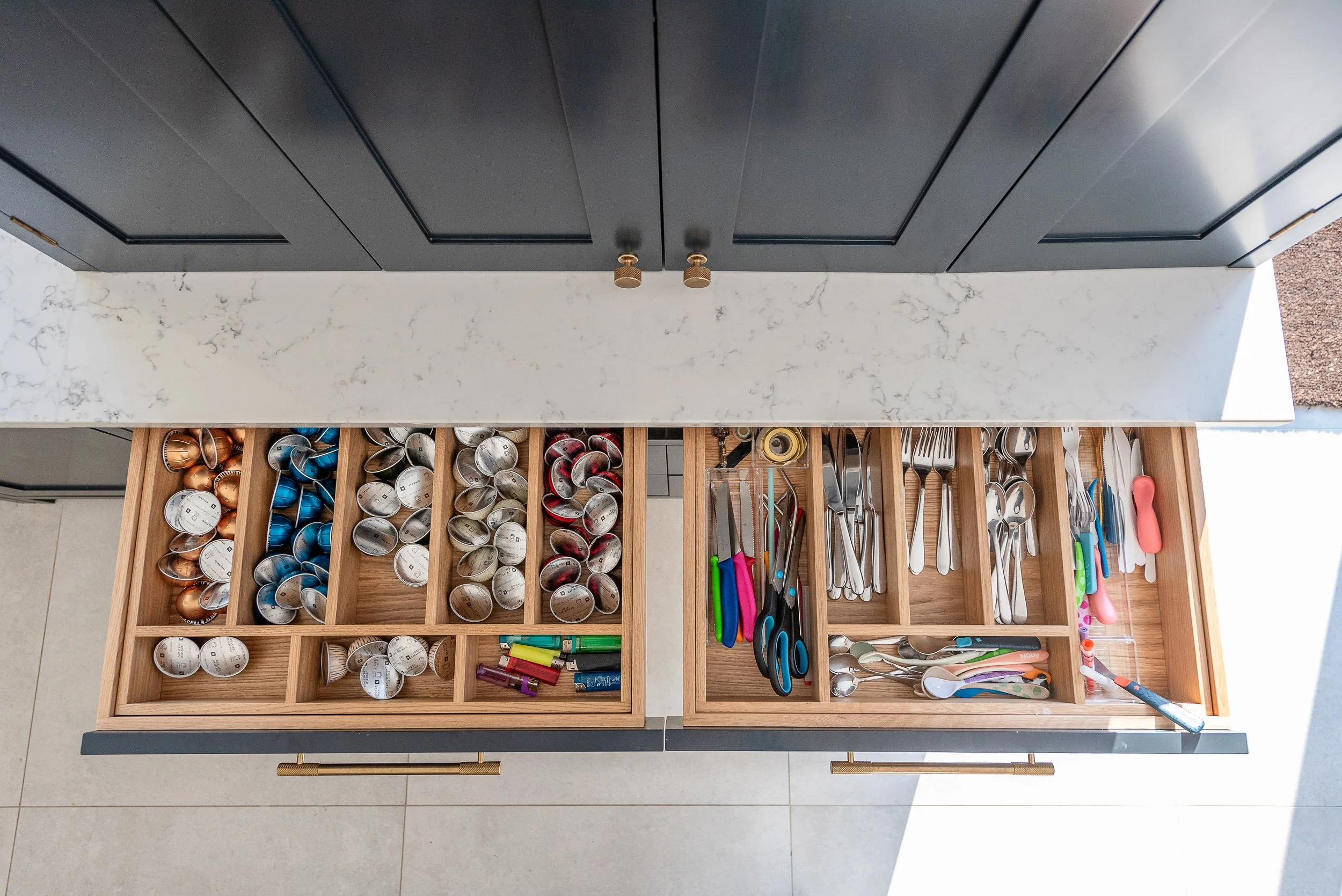 A corner cupboard on the worktop works well for a coffee/tea station as it’s right in the mix of the “action”, within easy reach and a way to maximise the use of space. Combine it with bi-fold or pocket doors for maximum functionality.