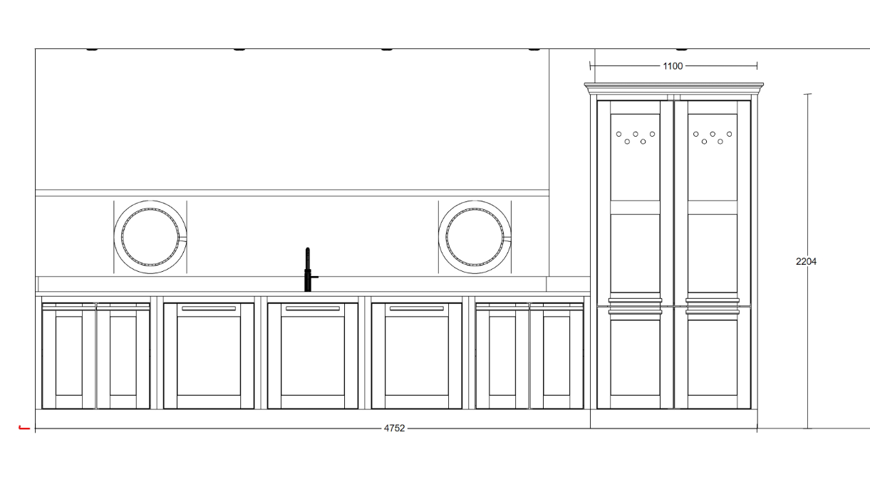 The space works as a large living, kitchen, dining area, which due to the nature of the design and bespoke make of the cabinets, flows seamlessly together as one. The original 1930’s round 'porthole' windows beautifully sit above the worktop and under the floating shelf which brings the design together.