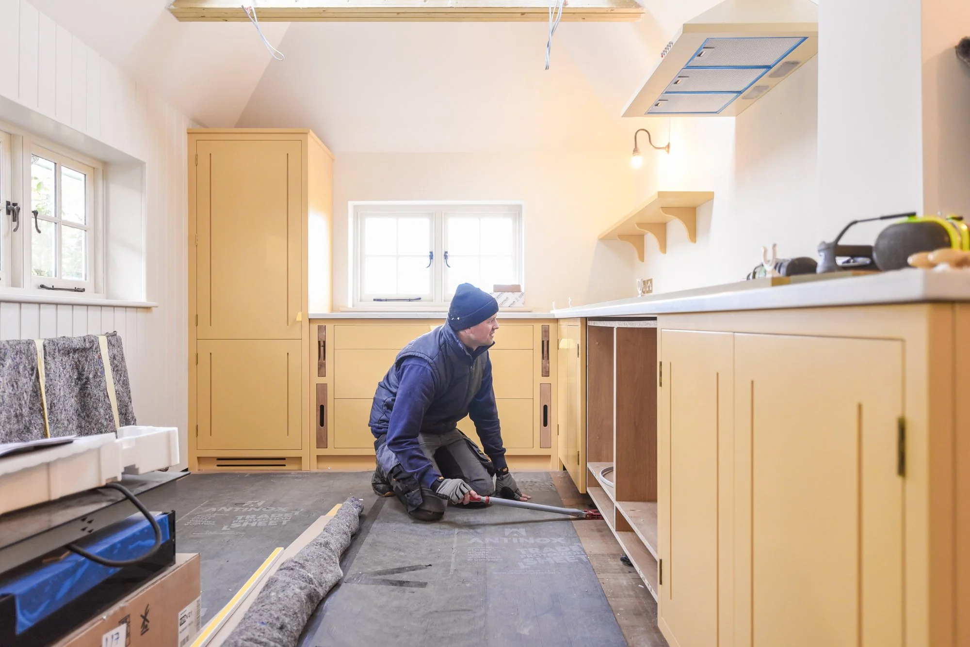 The bespoke cabinetry was designed with our client and we created a special door together just for them, this was handmade in our workshop. The clients worked with Luke and our Interior Designer Martyna to perfect the design so it utilised all of the space well, and felt country cosy, as the room is intended to be.