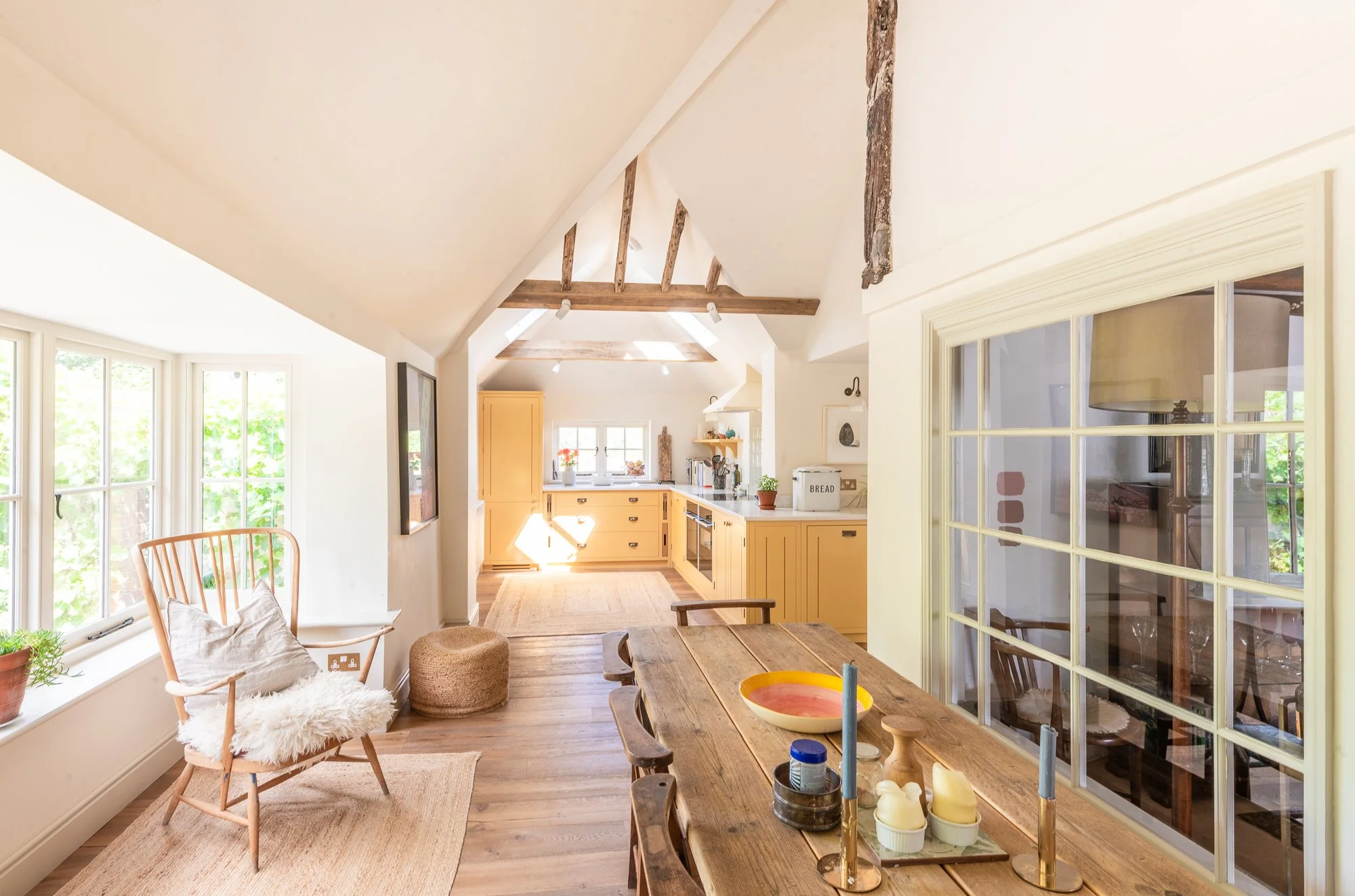 The client sourced their lights from the Old School Electric Elongated Prismatic Wall Light from Holloways of Lludlow. The dining chairs are original church chairs that they bought from an antiques shop in Rye, and the armchair is an Ercol. The table was made bespoke for them, from salvaged scaffolding boards by the brilliant Gibbs Design Furniture in Dargate near Faversham.