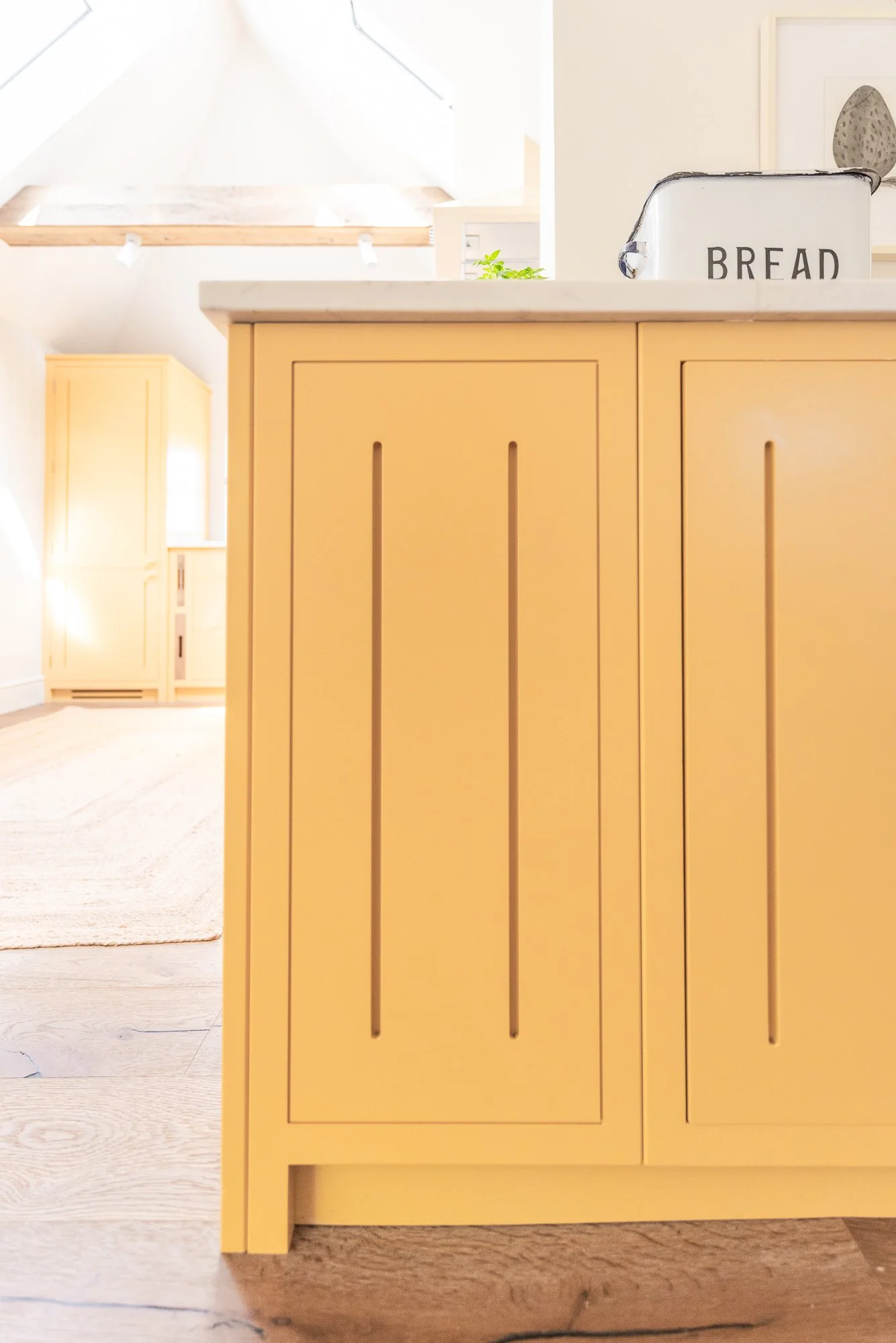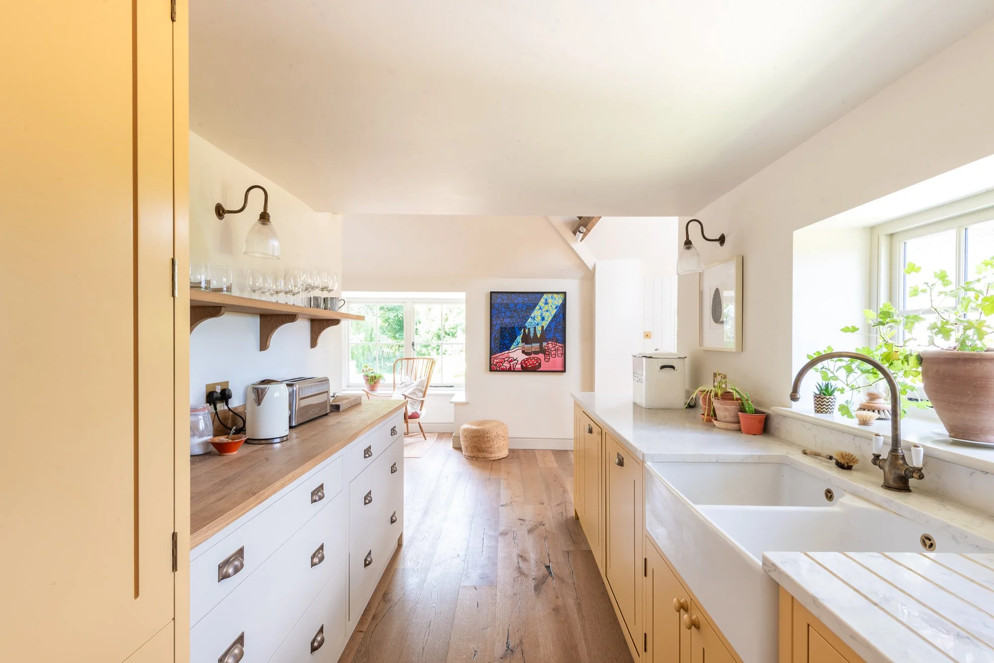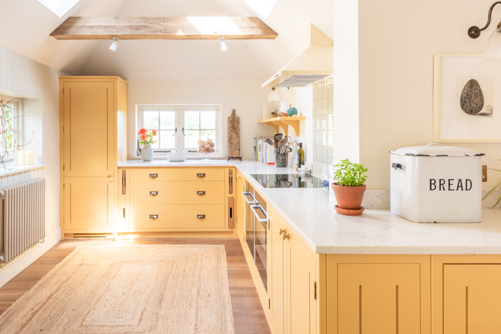 This beautiful project in Blean is so sunny and happy to look at. When the client bought this old farmhouse, it had already had various extension added on, so that the building was a bit of a pastiche, with lots of wiggly walls, which naturally leant itself towards a more country style kitchen. They knew they would need to renovate it as the property was lovely, but rather tired. The kitchen was a a very long, thin galley kitchen not really suitable for cooking and entertaining in the way they wanted. The house is a Grade II listed farmhouse with a Kentish catslide roof, so they enlisted architects with knowledge of heritage buildings. In the end the only way to achieve what they wanted was to knock three rooms into one, and get structural engineers to work out how to remove some of the old beams to open up the space. It was then quite hard to design the layout in the odd T-shaped room we were creating. It was important to keep the high ceilings, with lots of the old beams and rafters retained so that you can see the history of the building.