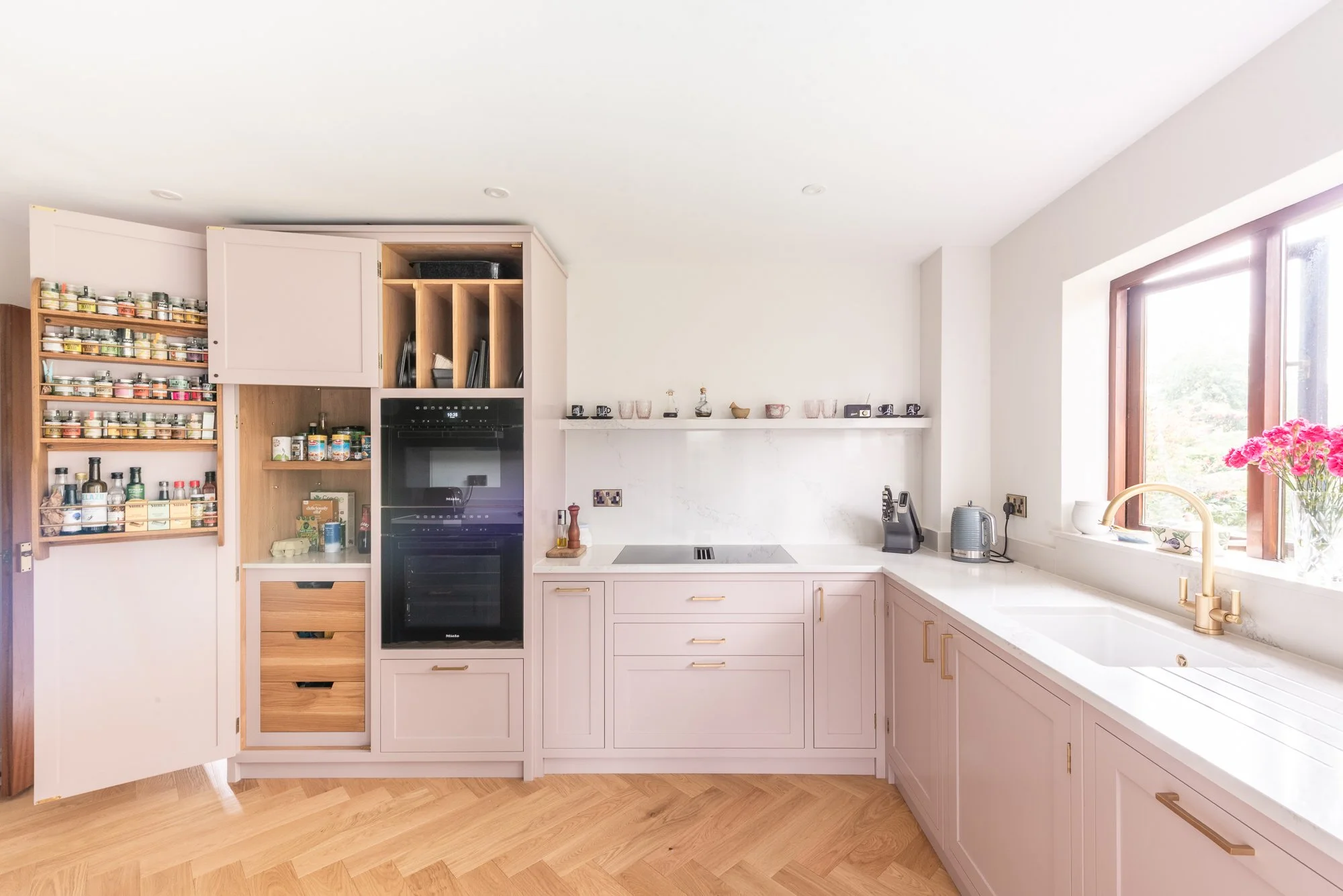 Then one day, walking down Palace Street, Pam passed the Herringbone studio and spotted a pink kitchen in the window. “I knew I wanted one. It just clicked. I’d heard of Herringbone years ago and liked the ethos. I wanted something family-run, local with thoughtful design. Seeing that kitchen made me think why wait? Go for the things we love.”