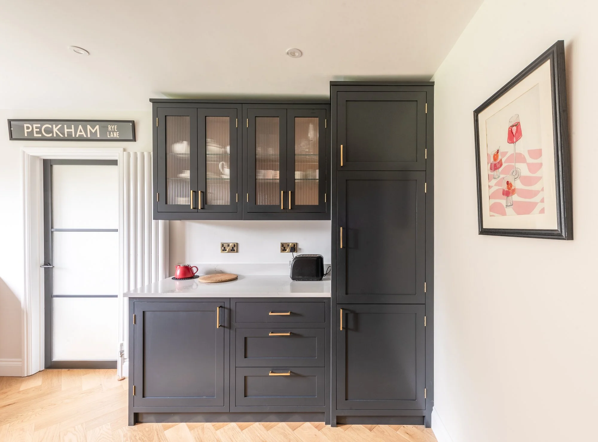 The client chose Herringbone Paints Tudor Black and Coop Pink The handles are beautiful handles in Brass. The appliances are from Miele. The worktop is Statutario Maxmius from Caeserstone and the cabinetry is in our modern Westminster range.