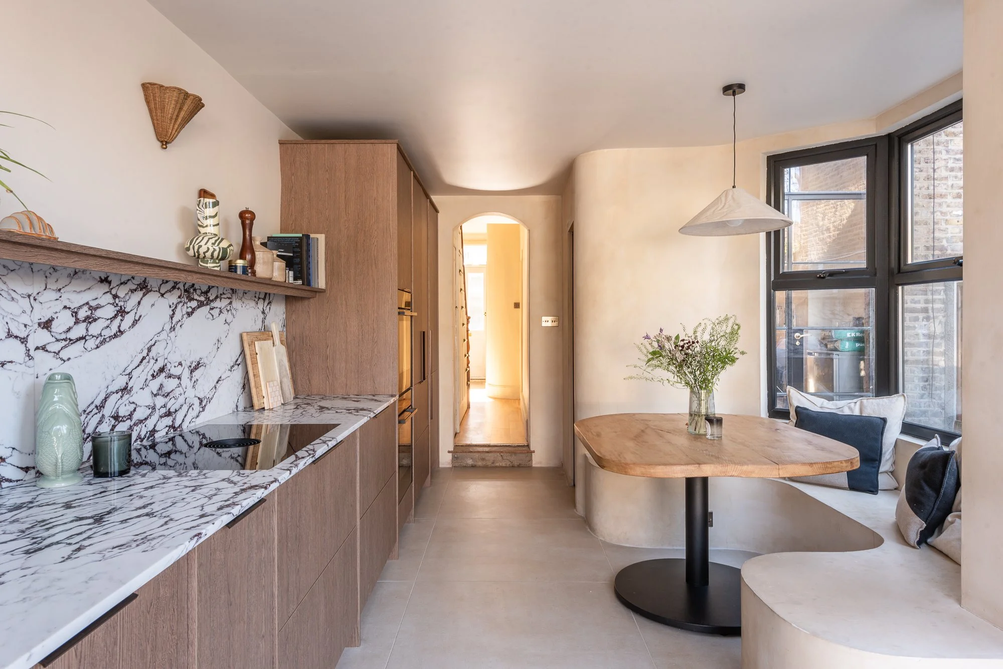 The client is best friends with David, the Studio Manager here at Herringbone. David helped with the entire design of their downstairs (perks of having a designer as a best friend). One of the hardest decisions was whether or not to include a downstairs toilet. After agreeing that the client needed one, David reconfigured the design so the toilet was out of the way and not separating their entertaining space. David designed a space that fit in a family table and added interesting elements like the curved wall and lime wash paint. The space almost feels Mediterranean whilst being in the middle of London.