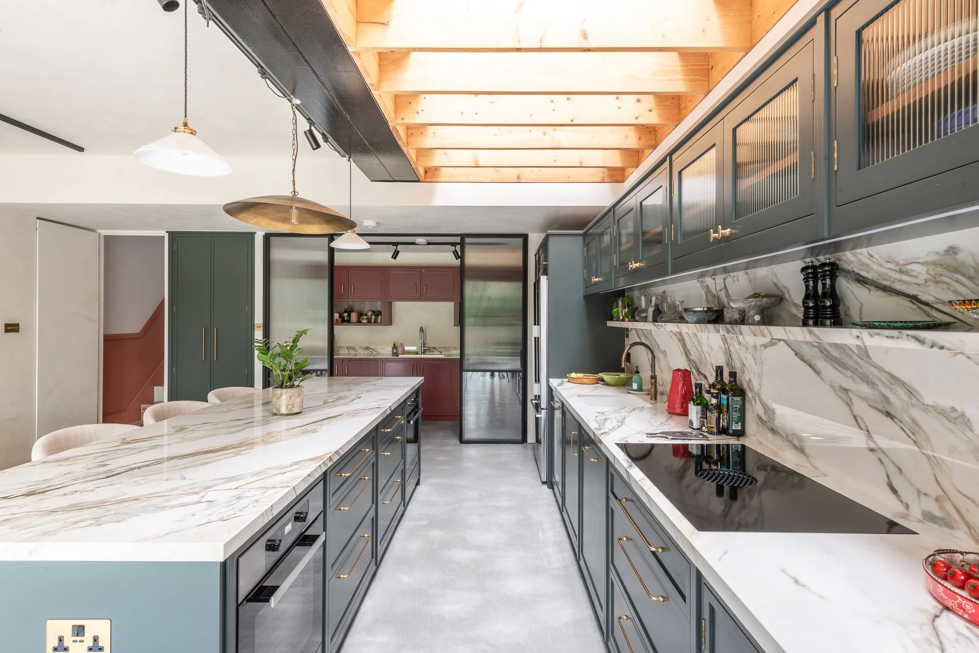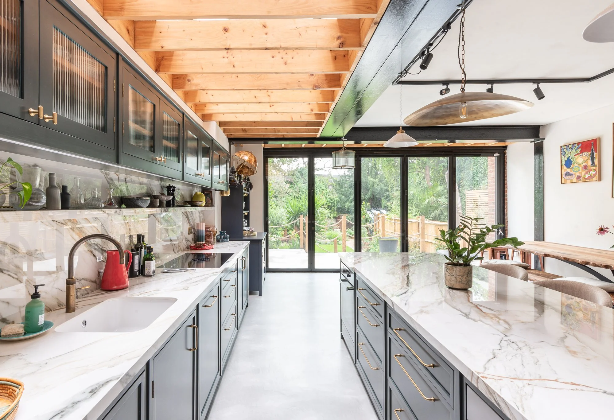 She also loves how the layout guides the eye toward the garden. “We have one long run of cabinetry opposite the island, which helps draw your gaze straight through to the bifold doors and out to the garden. We placed the fridge at the entrance to the room and put the ovens in the island, so there are no tall units interrupting that sightline.”
