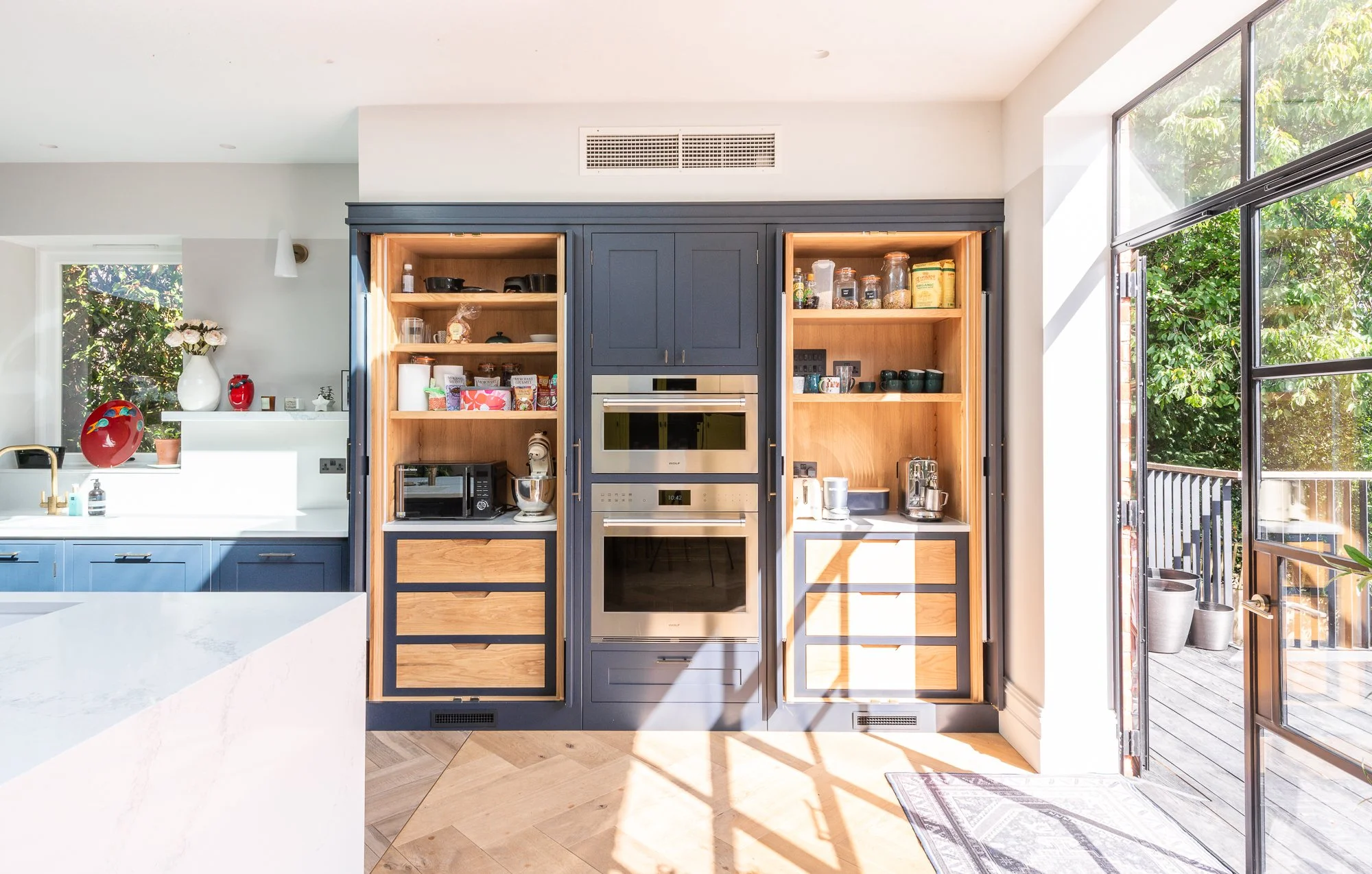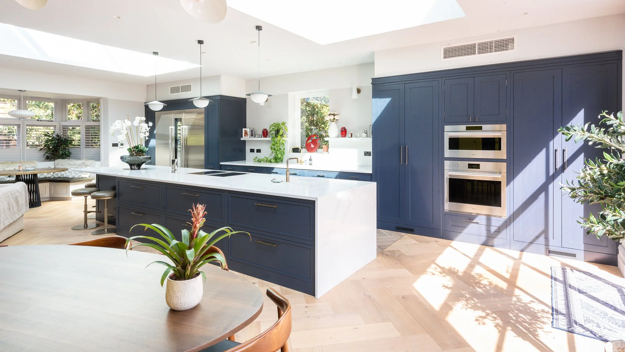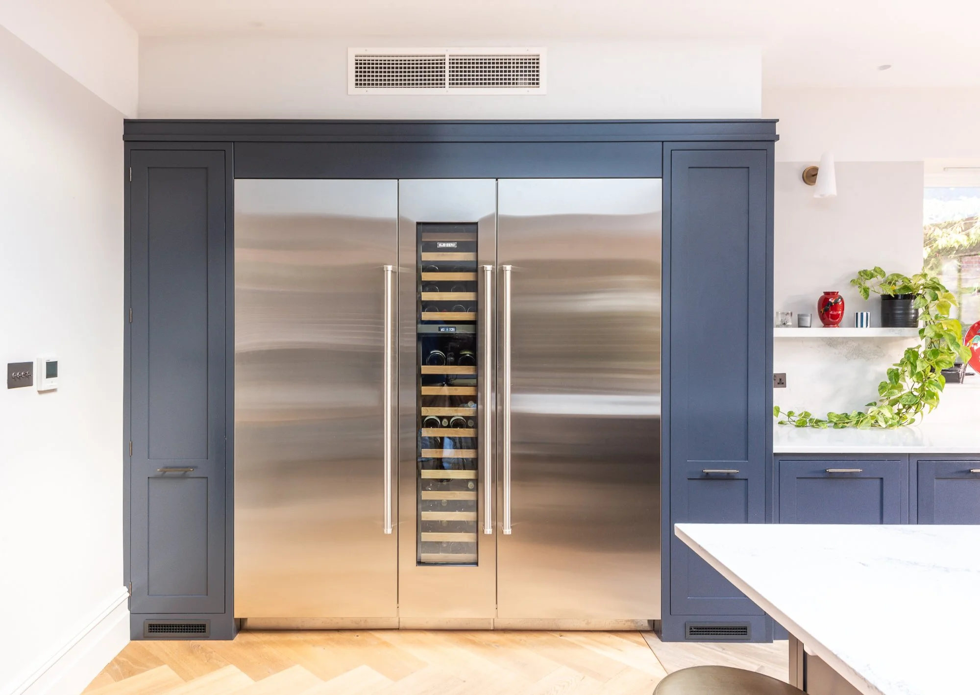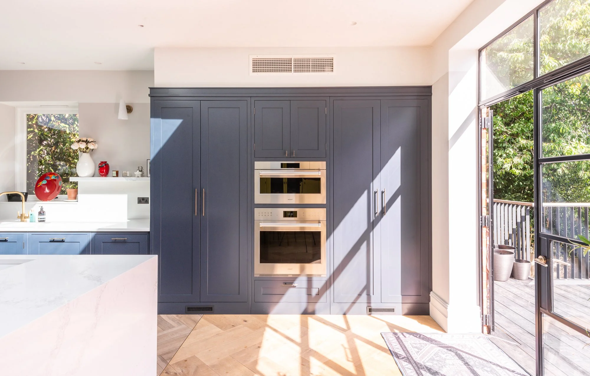 The client chose their own bespoke colours for the cabinetry in the project, which work perfectly together! The cabinetry is designed in our Westgate range, with modern slim frame. The worktop is in Caesarstone Quartz Statuario Maximus and beautiful appliances are from Wolf and Sub-Zero.